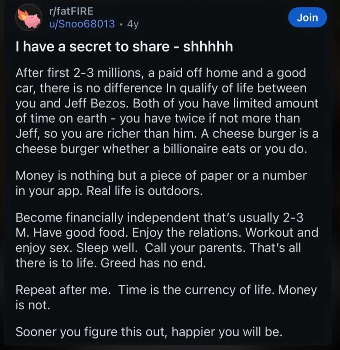 Alcanza la independencia financiera — suelen ser 2-3 millones. Come bien. Disfruta de tus relaciones. Haz ejercicio y disfruta del sexo. Duerme bien. Llama a tus padres. Eso es todo lo que hay en la vida. La avaricia no tiene fin.